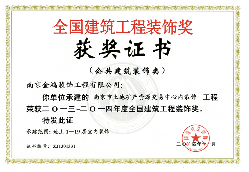 南京市土地礦產(chǎn)交易中心裝飾工程榮獲2013-2014年度“全國建筑工程裝飾獎”