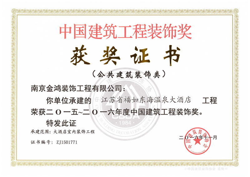 江蘇省福如東海溫泉大酒店裝飾工程榮獲2015-2016年度“中國建筑工程裝飾獎”