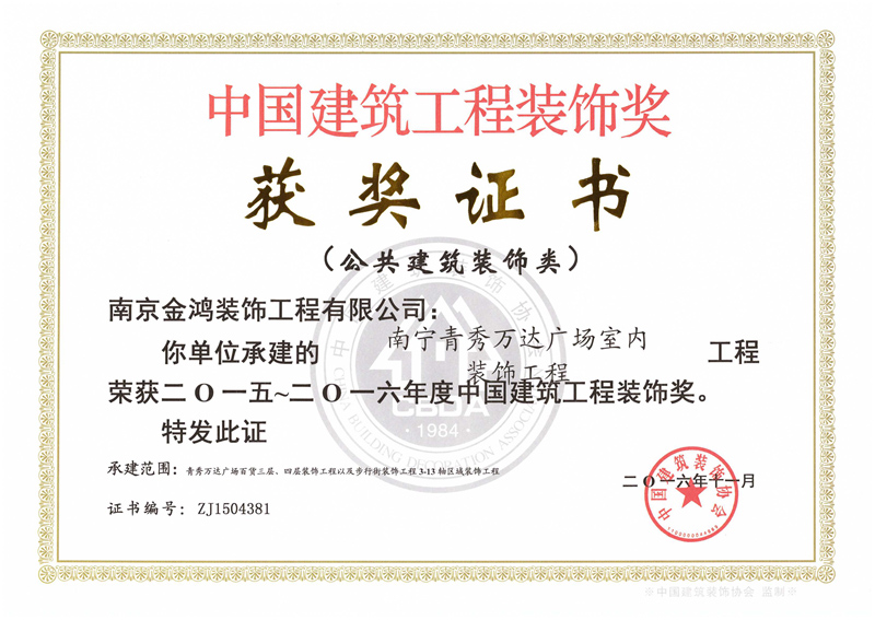 南寧青秀萬達廣場裝飾工程榮獲2015-2016年度“中國建筑工程裝飾獎”