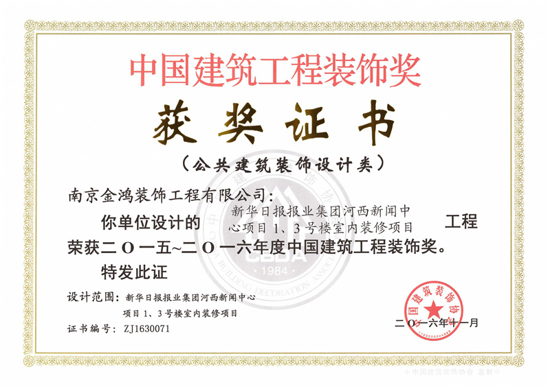 新華日報(bào)報(bào)業(yè)集團(tuán)河西新聞中心1、3號(hào)樓裝飾工程方案設(shè)計(jì)榮獲2015-2016年度“中國建筑工程裝飾獎(jiǎng)”