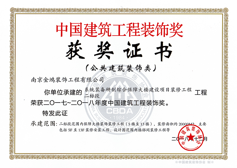 系統(tǒng)裝備研制綜合保障大樓建設(shè)項目裝飾施工榮獲2017-2018年度“中國建筑工程裝飾獎”