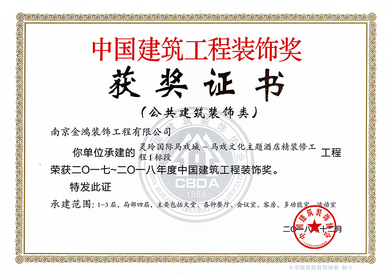 靈玲國際馬戲城-馬戲文化主題酒店裝飾施工榮獲2017-2018年度“中國建筑工程裝飾獎”