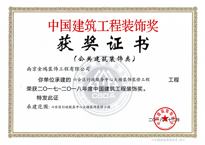 六合區(qū)行政服務(wù)中心大樓裝飾施工榮獲2017-2018年度“中國建筑工程裝飾獎”