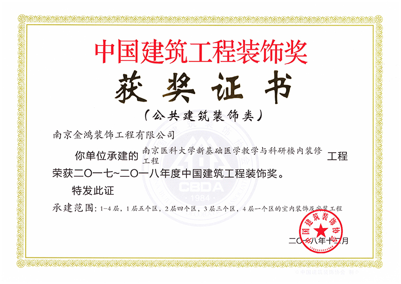 南京醫(yī)科大學(xué)新基礎(chǔ)醫(yī)學(xué)教學(xué)與科研樓裝飾施工榮獲2017-2018年度“中國建筑工程裝飾獎”?