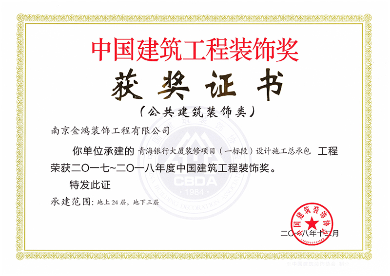 青海銀行大廈裝飾施工榮獲2017-2018年度“中國建筑工程裝飾獎(jiǎng)”