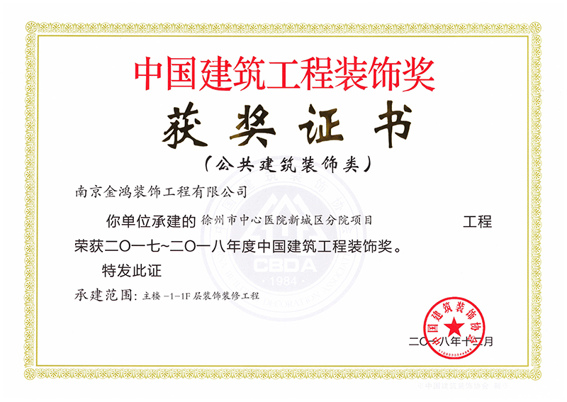 :徐州市賈汪區(qū)人民醫(yī)院遷址建設(shè)裝飾施工榮獲2017-2018年度“中國建筑工程裝飾獎”?