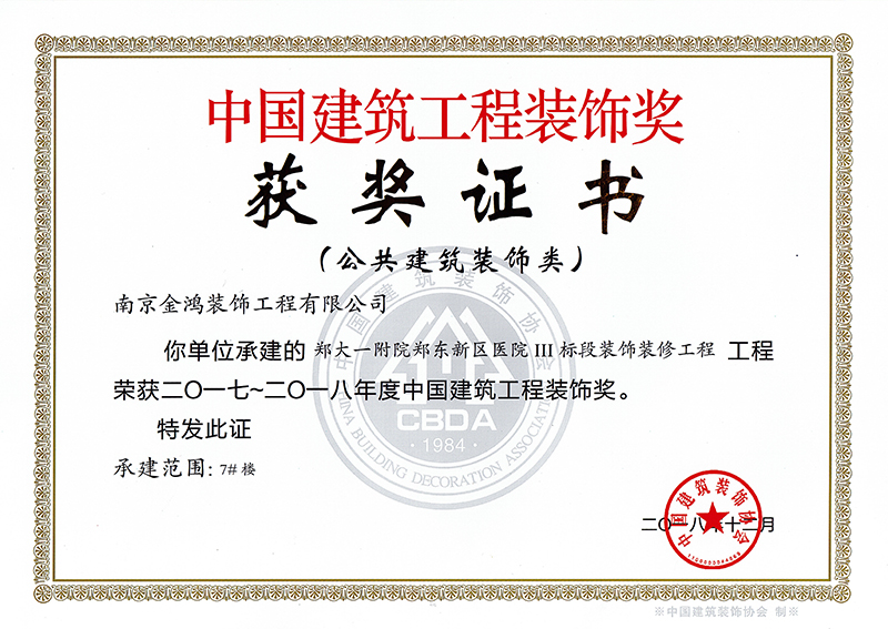 鄭大一附院鄭東新區(qū)醫(yī)院7#樓裝飾施工榮獲2017-2018年度“中國建筑工程裝飾獎”