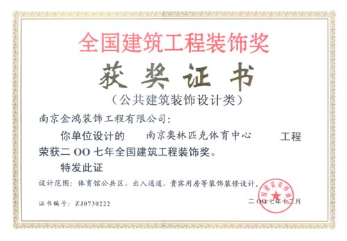 南京奧林匹克體育中心體育館榮獲2007年“全國建筑工程裝飾獎(jiǎng)”(公共建筑裝飾設(shè)計(jì)類)