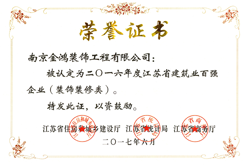 日前,由江蘇省住房城鄉(xiāng)建設(shè)廳、統(tǒng)計局、商務(wù)廳組織開展的2016年度建筑業(yè)“百強企業(yè)”企業(yè)揭曉。經(jīng)評議,認定南京金鴻裝飾工程有限公司為2016年度江蘇省建筑業(yè)百強企業(yè)、裝飾裝修類十強企業(yè),系南京唯一上榜企業(yè)(裝飾裝修類)。