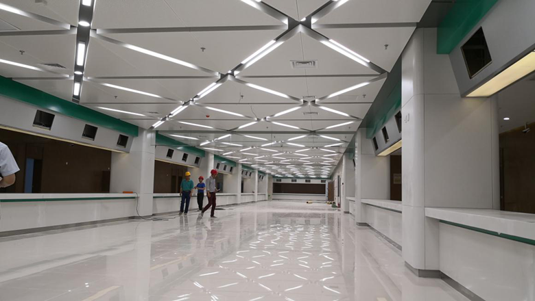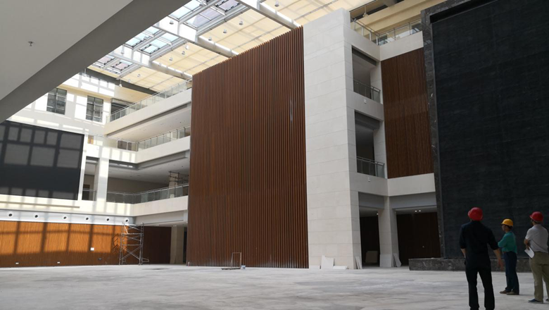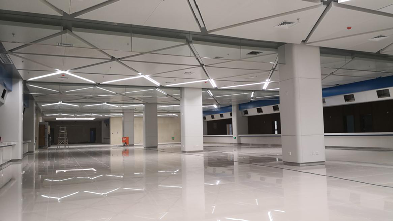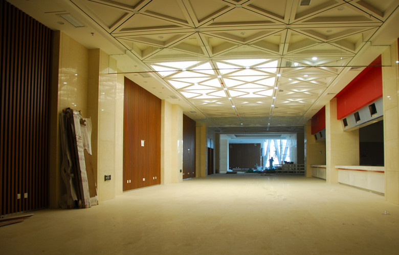 在選材方面,金鴻與設(shè)計(jì)師密切溝通,并定期派專人指導(dǎo),選取高品質(zhì)的優(yōu)質(zhì)環(huán)保材料,并一次性通過(guò)認(rèn)可。施工中,金鴻發(fā)揮項(xiàng)目部技術(shù)優(yōu)勢(shì),對(duì)工程中最重要的超寬異型鋁板吊頂工藝,提出了單塊分二、按軸線分組的模塊化施工方案,不僅解決了擋煙垂壁的安裝問(wèn)題,而且使單塊鋁板的造價(jià)降低了百分之三十,節(jié)省了鋁板的定制周期。